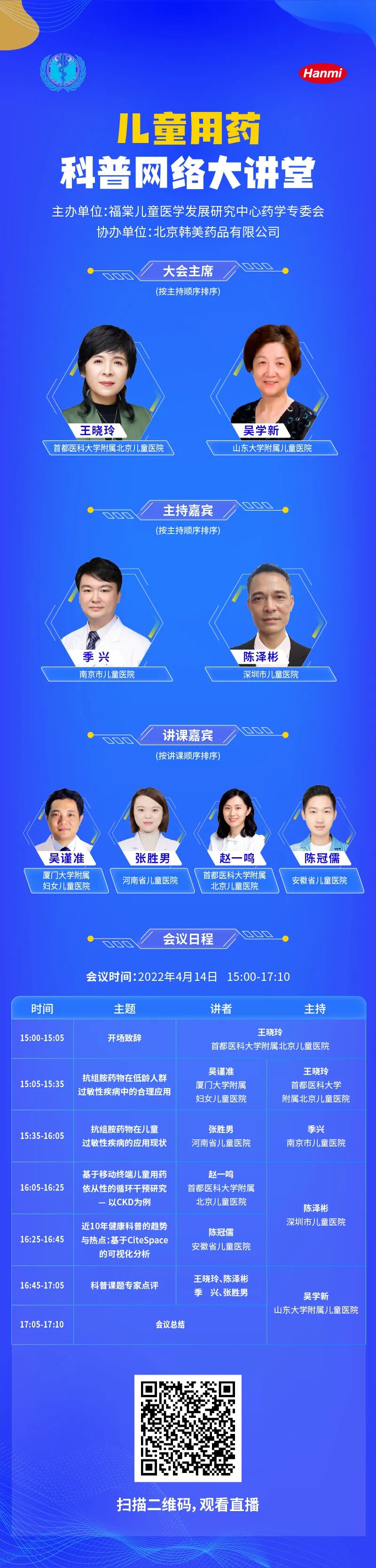 2022年科普网络大讲堂开讲啦,本期主要围绕抗组胺药物在儿童过敏性疾病中的应用以及两个科普课题进行探讨,科普与科研的专业盛宴就在4月14号下午三点,诚邀您届时观看!
