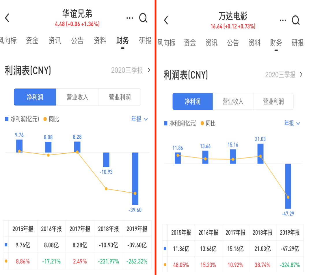 特别是2019年,华谊兄弟(300027)、光线传媒(300251)以及北京文化(000802)这些行业龙头公司都出现了较大金额的亏损。万达电影亏损超过47亿元,华谊兄弟亏损超过39亿元。