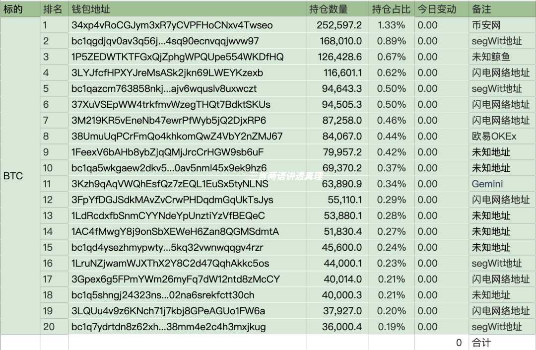 今日大饼前20地址中,地址持仓无变动,大饼前20地址合计共+0枚。