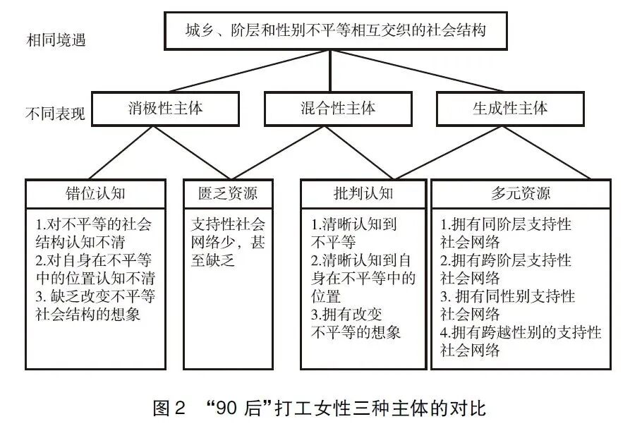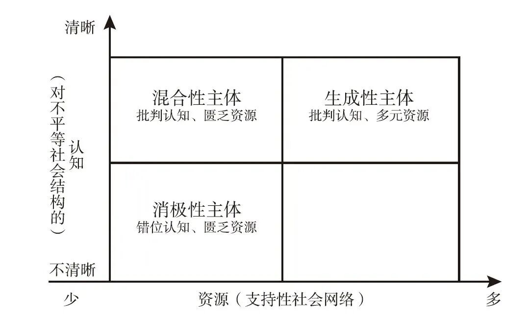 生成性主体与消极性主体迥然不同。虽然面对相同的社会结构(性别和阶层的双重不平等),但生成性主体不仅能够运用想象力和反思能力对不平等的社会结构进行批判,还能够建立起基于阶层和性别认同的支持性网络,从而为改变不平等的社会结构提供行动的基础。生成性主体与混合性主体都对不平等的社会结构具有批判性的认知,但是生成性主体却能够获得混合性主体所匮乏的资源。