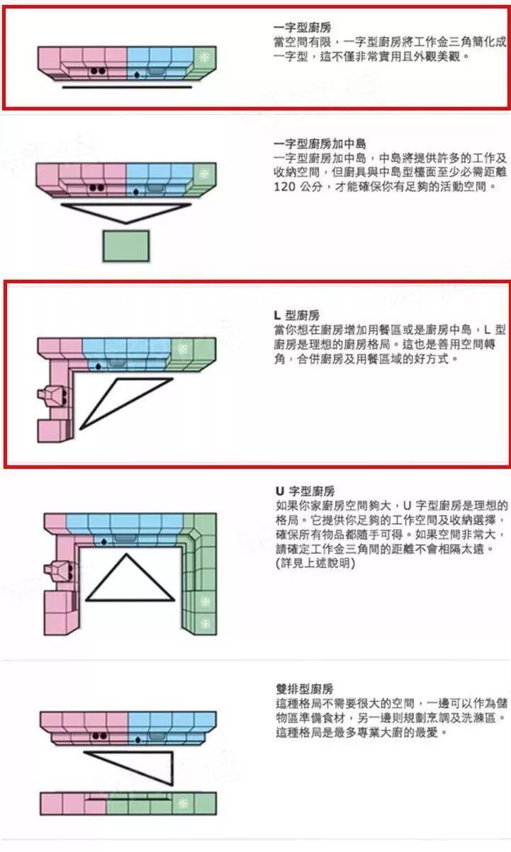 在上图五种常用的橱柜布局中,一字型厨房和L型厨房最适合小厨房。其中,一字型厨房适合面积小又狭长的厨房;L型厨房适合面积小但较方正的厨房。