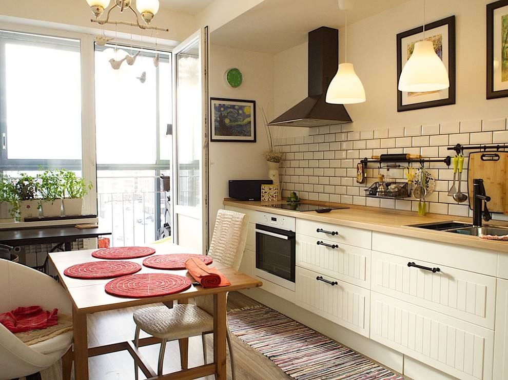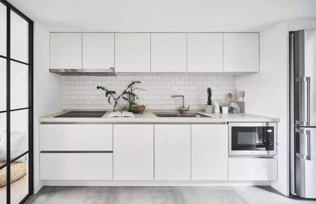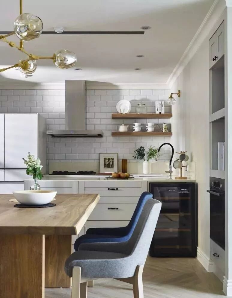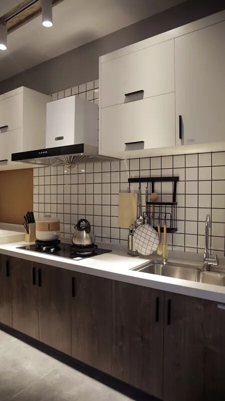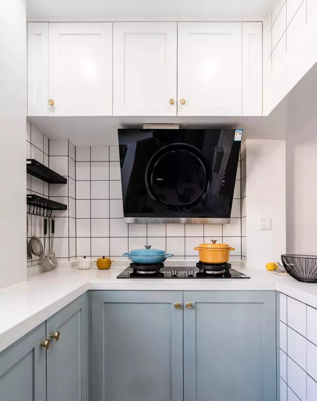 厨房油烟多,我们通常都是选择铺贴瓷砖。如下图,这种白色的小方砖,百搭款、无敌好配色。