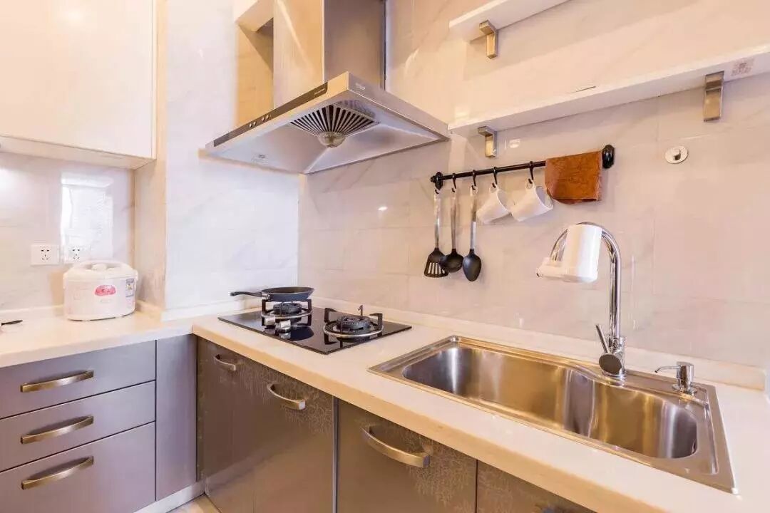 面积小,这是小厨房的硬伤。因此,操作台面肯定没有大厨房的长,放不下满意的双大水槽怎么办呢?