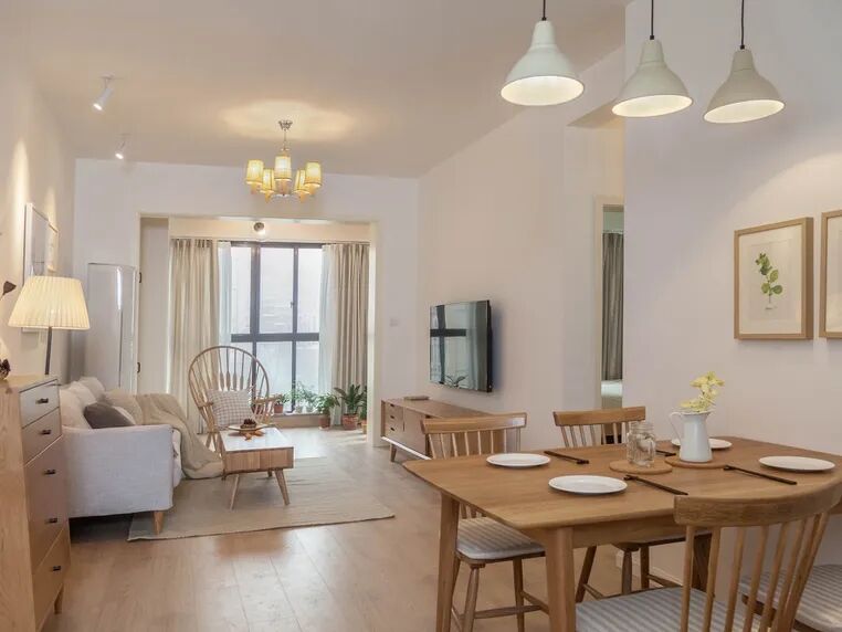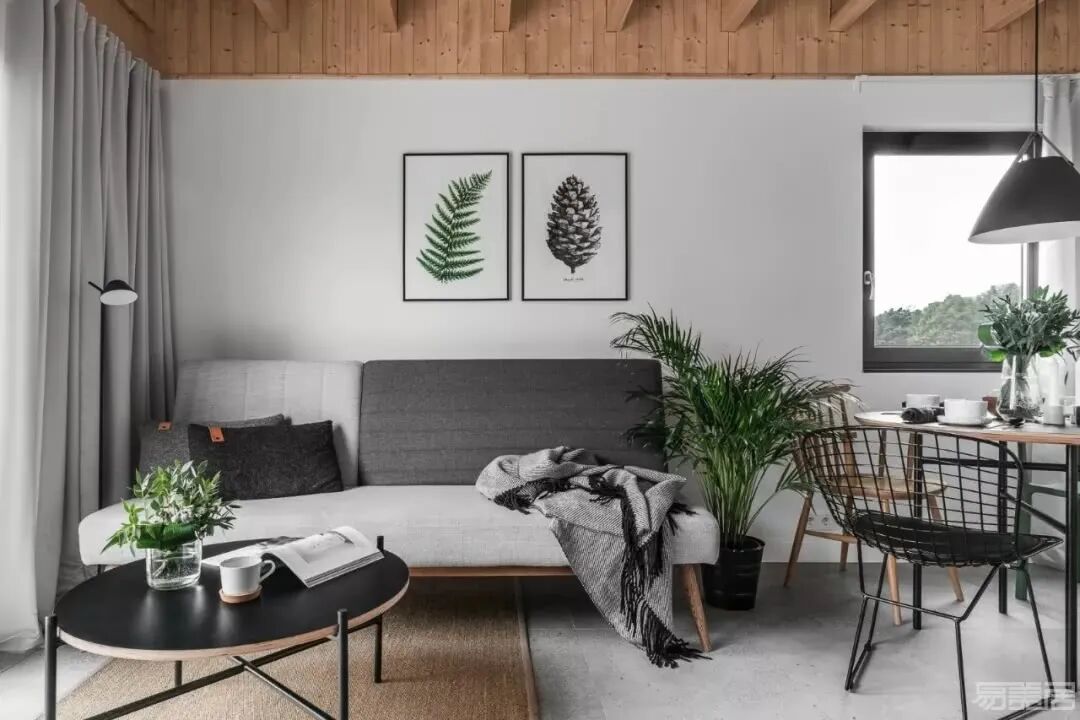 元素:浅色木质感、植物、小茶几、有趣的灯具、舒服的抱枕等