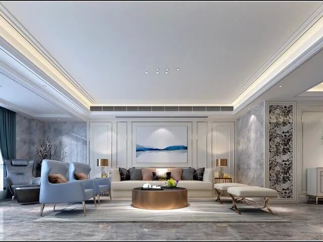 元素:石膏线、护墙板、现代艺术品、大理石、大型装饰镜、假壁炉等