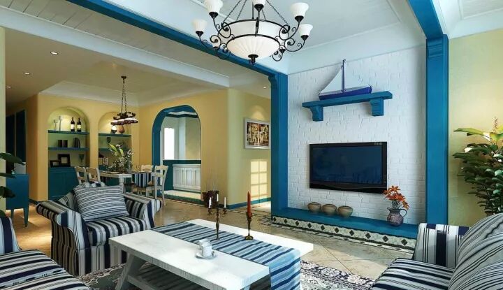 ⑤独特的装饰方式。在构造了基本空间形态后,地中海风格的装饰手法也有很鲜明的特征。马赛克镶嵌、拼贴在地中海风格中算较为华丽的装饰。主要利用小石子、瓷砖、贝类、玻璃片、玻璃珠等素材,切割后再进行创意组合。在室内,窗帘、桌巾、沙发套、灯罩等均以低彩度色调和棉织品为主。