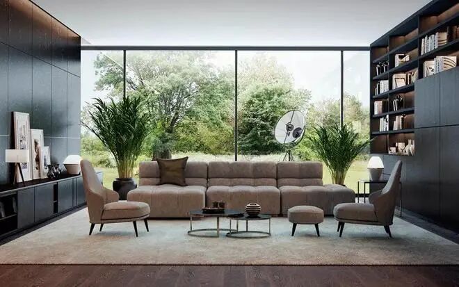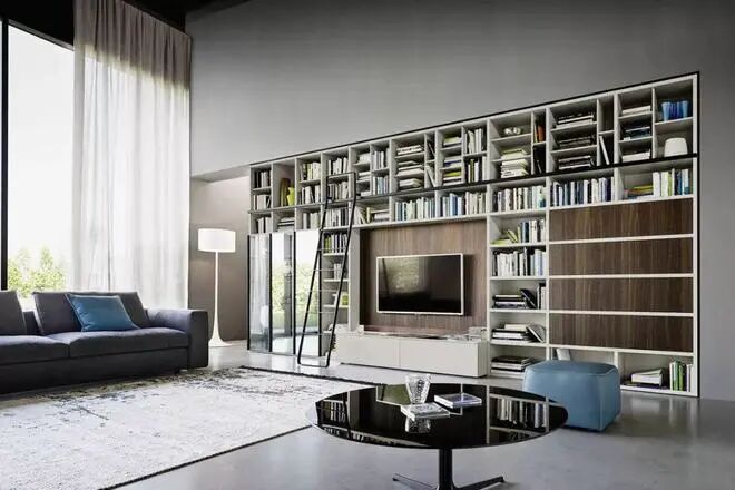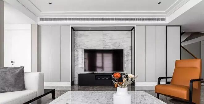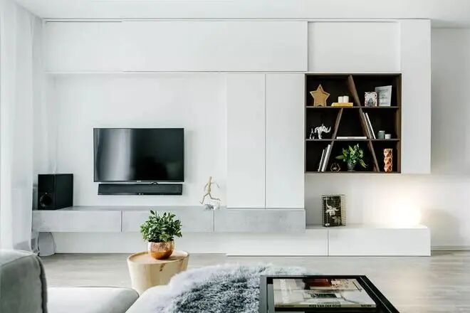 客厅里的遥控器、小家电、玩具、书籍、零食等各类杂物,如果没有收纳好,整个空间就会显得十分凌乱。那不妨把背景墙充分利用起来,做个满墙的电视柜,不仅大气美观,还能增加充分的收纳空间。
