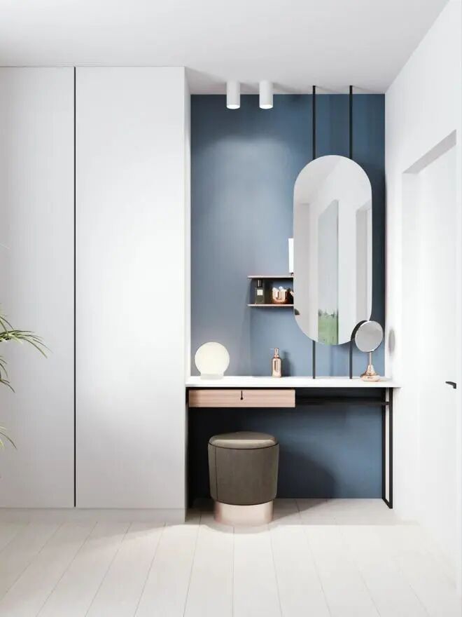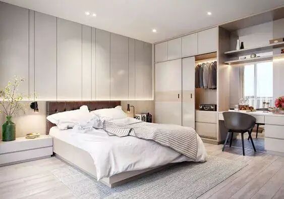 在现代家庭中,不建议单独买柜子,根据空间的尺寸定制整体衣柜,可以大大提高卧室的使用率,还可以加入梳妆台、书桌等功能。