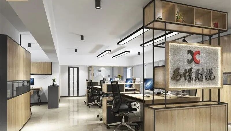 想要小平米办公室看起来“显大”,开放式布局肯定少不了。作为专业装修公司,在以往诸多经典案例中,经常利用开放式办公室布局来打造“宽阔视觉感”。如采用无隔断的办公桌工位设计,搭配去前台化创意设计,只保留公司名称与LOGO,利用博古架式隔断+柜子的设计,既能保留彰显公司招牌的前台作用,在视觉上又有隔而未断的联系,轻松“显大”还好看。