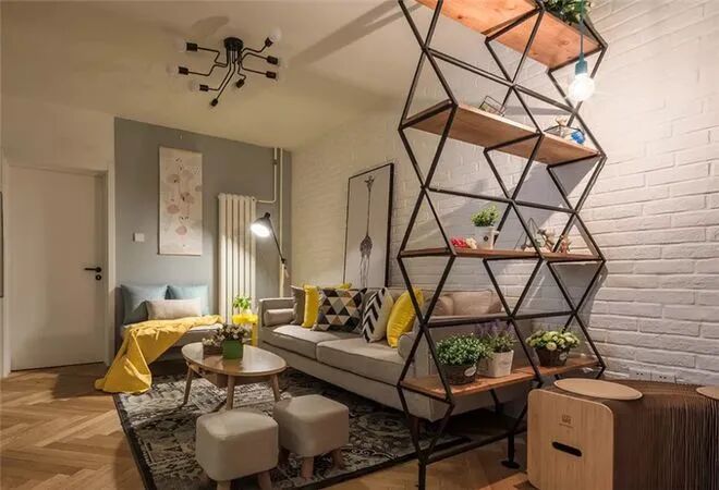 置物架做隔断,也不会耽误日常的收纳,除了书籍,还能放些摆件,装饰感不错,有点麻烦的就是清洁问题,不过现在有手持清洁器基本问题不大,不然的话就小面积利用就好。