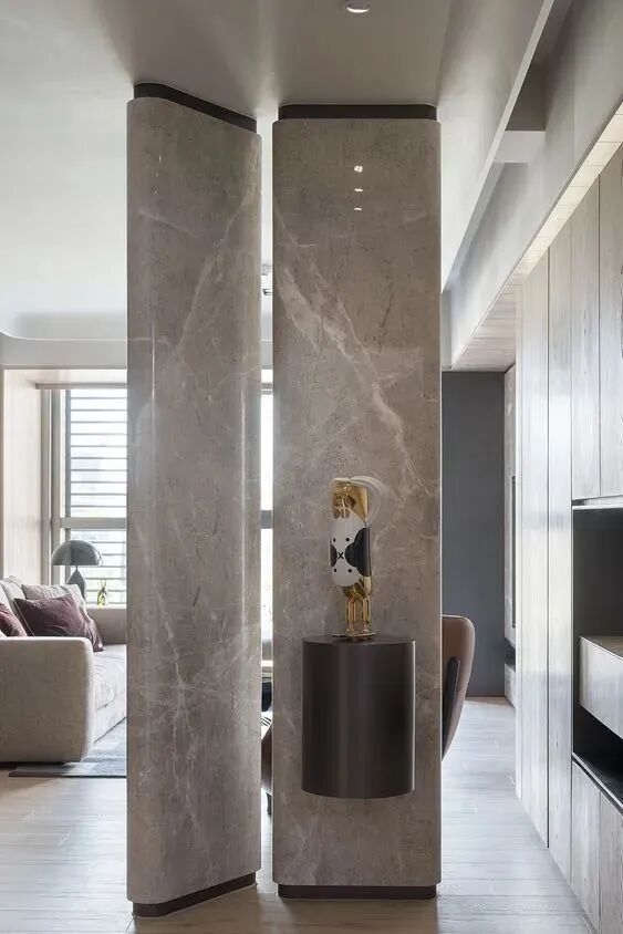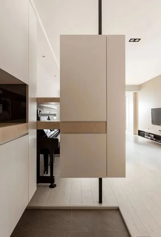 这种隔断更适合面积相对宽敞的户型,相当于在室内砌了一半的隔墙,不过利用率也是相当高的,当背景墙、做餐边柜、书桌都行,双面都能拿来用~