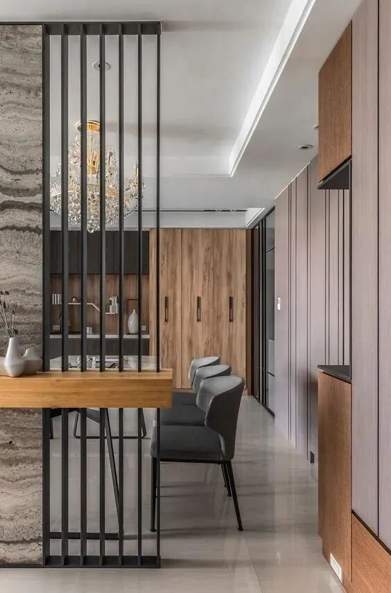 栅栏式隔断并不只有木质一种,其他的材料像金属线条、铝合金等都能酌情考虑,还能和其他的材质适当进行结合,避免单色使用上的单调。