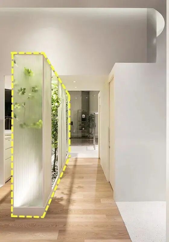 室内隔断基本不会用透明玻璃,避免碰撞,有些住户实在担心,也能换成轻质墙,将边缘处理呈弧形,调整下位置局部留出缝隙就好。