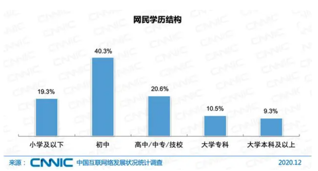 如果你一头雾水,千万不要着急。根据2020年网民年龄调查 ,中国网民越来越年轻化,对应学历结构显示:中学及其以下学历的网民加起来占比高达80%——当网民的年龄群体越来越小,那么网络流行语逐渐贫瘠/幼稚化也顺理成章。