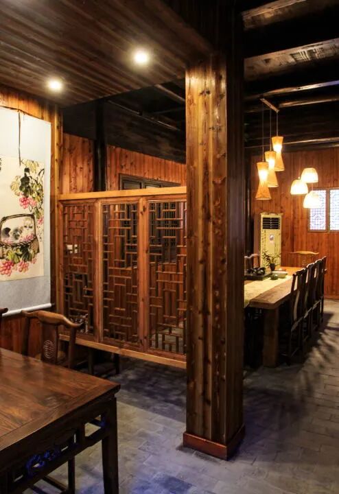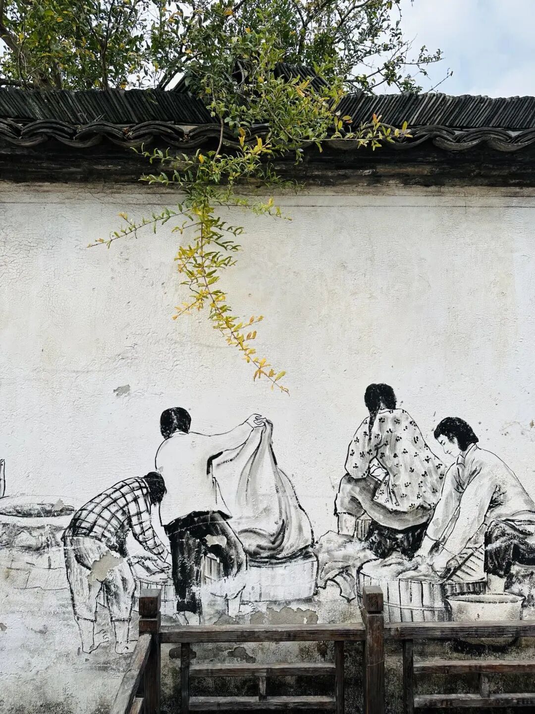 宅院所有都是中式设计和细磨,宁静质朴,回归本真,这也是驿事一贯的风格和秉性,所谓我慢慢地做,你静静地住。茶室、餐厅、洗衣房、庭院、中堂、书吧、娱乐室等等,应有尽有,满足你对武侠小说中江湖客栈的所有幻想,既能体会古镇的闲适安然,又能感受老屋的独特味道。值得一提的是,客栈房号也极富特色,均取自词牌名,如“好事近”、“南歌子”、“浣溪沙”……文艺范十足,与龙门的古镇气质、诗情画意的周边环境相得益彰。富春江南岸、仙霞岭余脉的龙门山脚下,龙门古镇这个江南最大古村落历经千百年,从一个大家庭的聚居地,成为了今日的古镇。生活在此处,清淡、安逸而单纯,与嘈杂涣离,与纷乱无缘。小街窄窄的,边上一侧的青石板下,河水流淌,踏在古镇的鹅卵石上,脚步也会轻快起来,那是一份隐遁的惬意,只有亲临才能有体验,只有慢慢地走,才能全然感受。龙门老街绵延一公里,沿街商铺林立,格局特色,凸显出清街的古韵味。当你走在悠悠长长的老街上时,那种时光回流的温情,会让来访者感受到岁月的浪漫。▲古井边的绘画,还原了旧时的捣衣模样@ 摄/Regine_mi富阳人总是懂得怎么将当地的食材惊艳世人。像龙门古镇的村民,就把当地的黄牛肉做到了极致。既然来了龙门古镇,就一定要尝一尝这龙门的特色。要吃就要吃一口正宗的~古镇巷子里的餐馆,拿手菜一定是这黄牛肉做成的牛八碗!当然,这名声远扬的牛八碗,还有一段改良小故事。