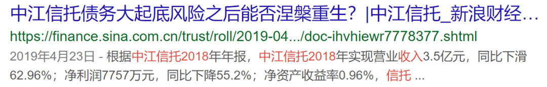比如在2019年踩雷比较多的中江信托,我看了下它2018年的净利润不到8000万,收入也只是3.5亿: