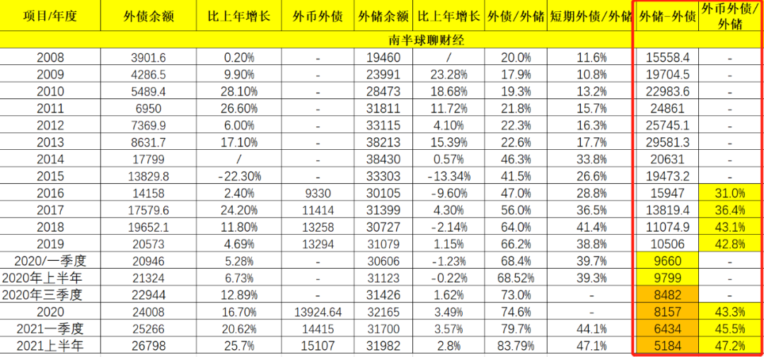 这就像最近很多人在出谋划策让银行来兜底地产商的美元债,不多说,放一张整理的“历年外储-外债”表: