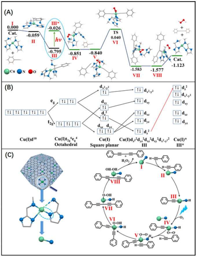 (A) 苯乙炔在Cu SA/ZIF催化剂上的自偶联反应中间体和过渡态的自由能图。(B) 铜(I)配合物的定性轨道分裂模式。(C) 所提出的在Cu SA/ZIF催化剂上的苯乙炔自偶联反应机理。![]()