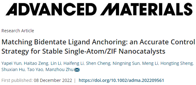 原子级分散单原子催化剂(SACs)是一种独特的多相催化剂,由于其高催化效率优势,被认为是催化技术升级的关键。然而,表面自由能的急剧增加使其容易快速聚集成大的纳米粒子 (NPs),特别是在高温和/或还原条件下。因此,在工业应用中使用 SACs 存在两个主要瓶颈:增加金属负载和具有可控的配位环境。众所周知,SACs稳定性和性能调控与金属-载体相互作用密切相关,这可能是解决上述瓶颈问题的重要途径。具有精确多孔结构和可调节成分的金属有机框架 (MOF) 被认为是稳定 SAC 的理想平台,其为高级催化剂的合理设计提供了更深入的构效关系分析。尽管 MOF 中存在局部孔隙,但 MOF 与金属离子前体之间的弱相互作用在大多数情况下仍不足以锚定大量孤立的金属原子,这是设计高负载和稳定的 SA/MOF 复合材料所面临的挑战。例如,研究人员成功制备了 CuSA/UIO-66 纳米复合材料,其中 Cu 原子共价连接到双齿 O-配体。他们还证实了 CuSA/UIO-66 在 CO 氧化反应中的稳定性,证明双齿 O-配体可以稳定地捕获和保护 Cu 原子。但是,由于 MOF 缺陷数量有限,无论 Cu 盐的添加量如何,Cu负载量不会有较大的提升。考虑到共价连接与双齿配体的强相互作用,“匹配双齿配体”(MBL)锚定策略可能是构建高负载SACs的通用且简便的方法。在现有的双齿配体中,双齿N-配体具有最好的筛选金属络合物和稳定金属离子的能力。由于沸石咪唑骨架(ZIF)材料中含有大量的N原子,它可能是一种用于研究 MBL锚定策略的理想材料。然而,ZIF 中的 N 原子间距太宽,无法形成双齿配体来稳定单金属离子。![]()