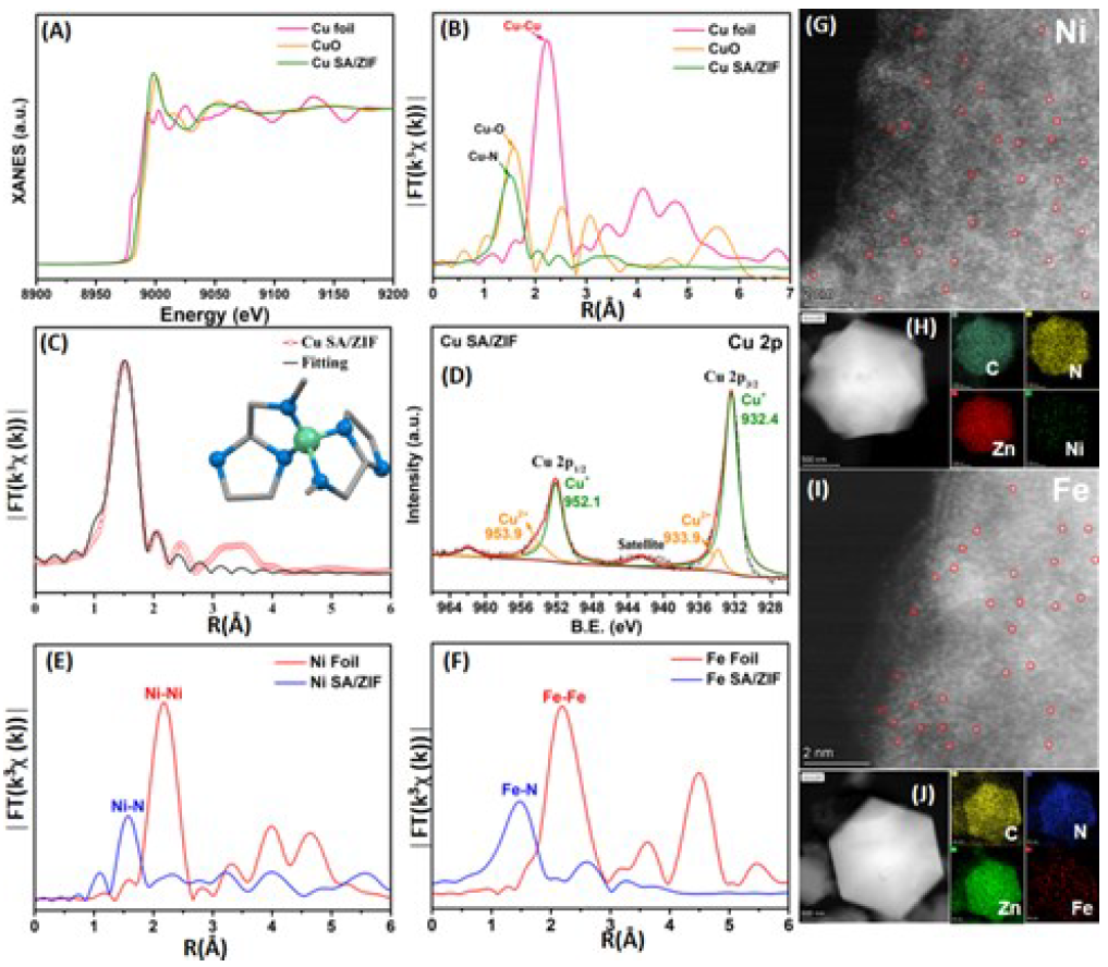 图3. (A) Cu K-edge XANES;(B) Cu K-edge 傅里叶变换 EXAFS 光谱。(C) Cu SA/ZIF 在R空间的 EXAFS 拟合曲线。(D) Cu SA/ZIF 催化剂的 Cu 2p XPS 光谱。(E-F) Ni SA/ZIF 的 EDS 元素mapping图像和 AC HAADF-STEM 图像。(G) Ni K-edge 傅里叶变换 EXAFS 光谱。(H-I) Fe SA/ZIF 的 EDS 元素mapping图像和 AC HAADF-STEM 图像。(J) Fe K-edge 傅立叶变换 EXAFS 光谱。![]()