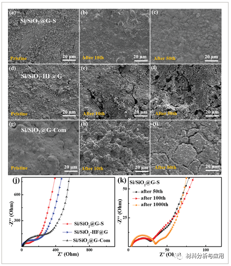 图6、a-c)Si/SiO2@G-S,d-f)Si/SiO2-HF@G,g-i)Si/SiO2@G-Com在循环前、循环10次和循环50次后的原位扫描图像。