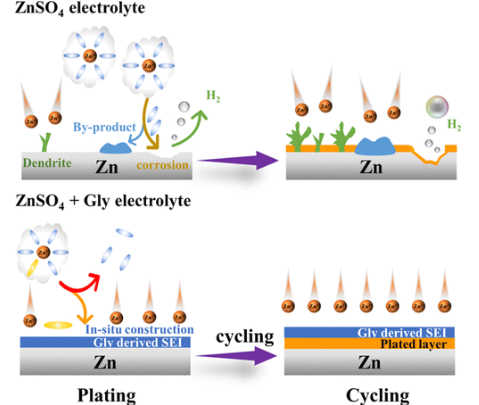 锌金属在水性电解液中是热力学不稳定的,这在电镀过程中甚至在储存期间会引起枝晶生长和界面上正在进行的副反应,导致电池快速失效并阻碍了水性锌离子电池的实际应用。武汉理工大学麦立强教授和Qinyou An等将一种常见的多功能添加剂甘氨酸用来调节溶剂化壳层结构和提高界面稳定性,以保护锌阳极的可逆性和稳定性。除了部分取代Zn2+[H2O]5·OSO32–络合物的接触离子对中的SO42–以抑制界面处Zn4(OH)6SO4·xH2O副产物的形成,甘氨酸分子还可以在静止期间在锌金属表面形成贫水双电层,并在循环期间被进一步还原以原位构建富含ZnS的固体电解质界面(SEI)层,这进一步抑制了整个过程中的副反应和锌枝晶的随机生长。正如预期的那样,在含甘氨酸的电解液中,对称电池的循环寿命达到3200小时以上。此外,Zn//NVO全电池在5 A g–1下循环3000次后表现出优异的循环稳定性。鉴于甘氨酸的低成本优势,所提出的界面化学调控策略在促进水电池商业化进程方面显示出相当大的潜力。参考文献:Interfacial Chemistry Modulation via Amphoteric Glycine for a Highly Reversible Zinc Anodehttps://doi.org/10.1021/acsnano.2c09317