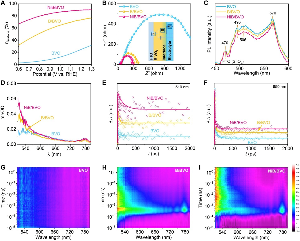 图5. (a)表面电荷分离。(b)在NaB (pH 7)中的PEC阻抗谱(PEIS)。(c)光致发光光谱(PL)。(d)在350-nm光下的时间分辨瞬态吸收光谱。(e) 510-nm和(f) 650-nm衰减,衰变拟合采用全局四指数衰变模型所计算,并采用实线表示,实验测试数据用圆表示。(g) BVO, (h) B/BVO, (i) NiB/BVO在350-nm光激发下的时间分辨瞬态吸收光谱。