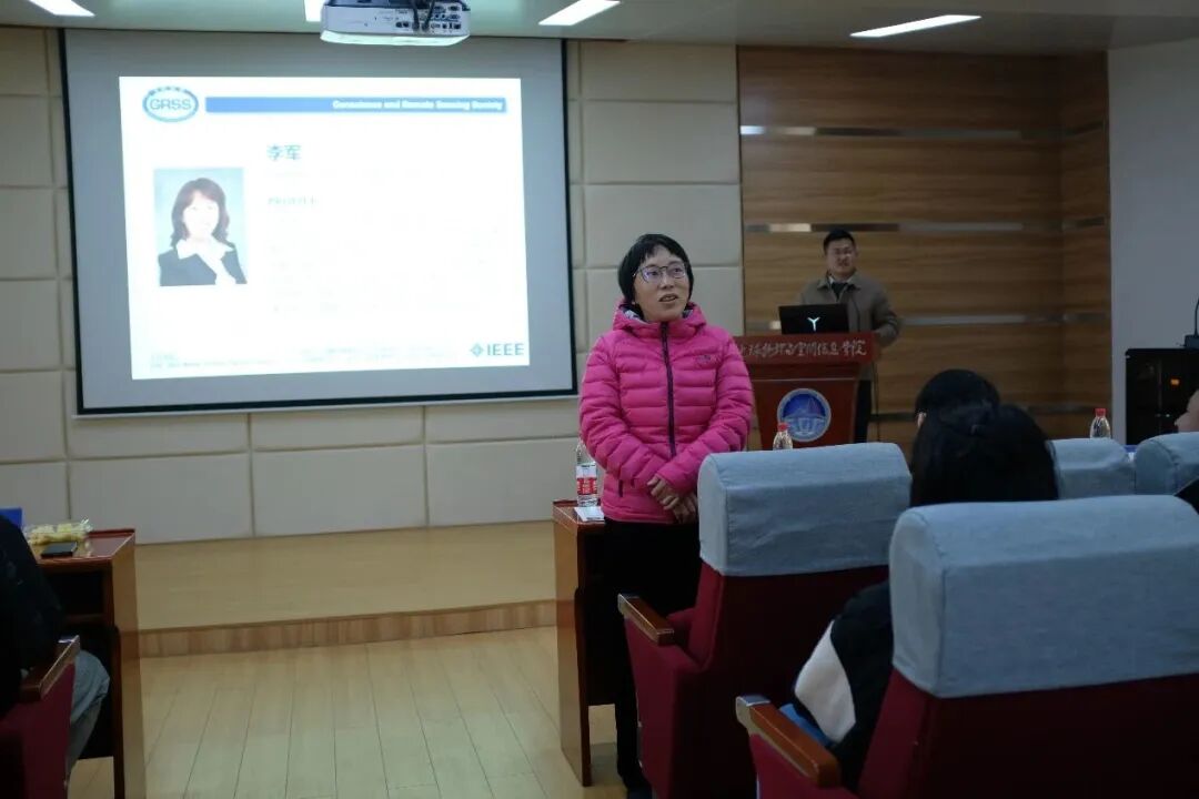 会议下午场在中国地质大学(武汉)物探楼报告厅举办。IEEE Fellow、中国地质大学(武汉)李军教授致辞肯定了IEEE GRSS Wuhan分会为促进地球科学与遥感领域发展所做的工作,并祝愿参会同学学者有所收获,有所感悟,不虚此行。西安电子科技大学冯婕教授也分享了其参与分会活动的感想感悟,鼓励同学们一步一个脚印,勇攀科技高峰。