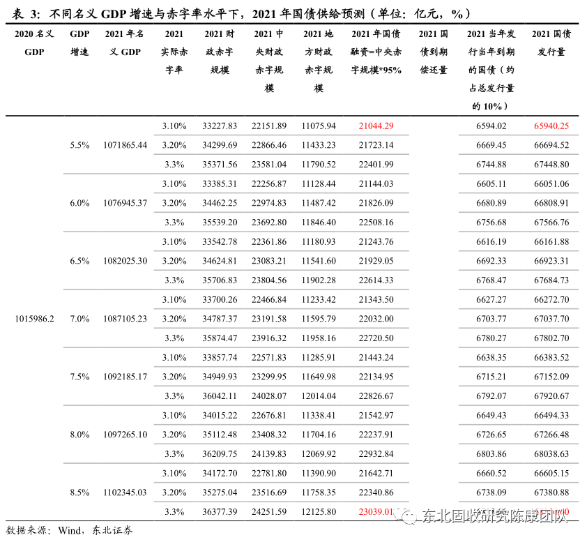 我们测算国债发行量的思路是,先预测2021年国债净融资额的区间,再根据已知的2021年国债偿还量,倒推出2021年国债发行量的数值。 国债净融资额与财政赤字规模具有一定的比例关系。财政赤字分为中央财政赤字和地方财政赤字,两者占比会有一定波动,但是近年来基本稳定在2/3和1/3的水平上。在中央财政赤字中,每年约有95%是通过发行国债弥补的,由此可以推算出国债的净融资规模。因此,只要我们计算出2021年财政赤字规模的预测值,就可以得到国债净融资额的预测值。 对于2021年财政赤字规模,我们使用“名义GDP和目标赤字率的乘积”来计算。2020年名义GDP为101.60万亿元,根据今年两会提出的6%的增长目标以及我们预测的2021年1.5%左右的通胀率,可以得到2021年名义GDP应至少为109.31万亿元。此外,按照两会提出的2021年财政赤字率拟按3.2%左右安排,2021年的赤字规模目标预测值约为3.50万亿元。实际上,两会提出2021年赤字规模为3.57万亿元,数值上稍高于我们的测算值。如果按照两会提出的357000亿元赤字规模,结合3.2%的赤字率,我们可以倒推出2021年的名义GDP应该在111.56万亿元,名义增速接近9.81%,按照1.5%的通胀计算,实际增速接近8.19%。这与6%的目标增速之间存在一定偏差,因此我们不妨认为,政策层面的合意目标增速在8%左右的位置。 按照财政赤字3.57万亿计算,中央财政赤字和地方财政赤字按照2/3和1/3的比例划分,依次为2.38万亿和1.19万亿。其中,中央财政赤字和国债净融资额的关系比较大。根据2014-2019年的数据,“国债净融资/中央财政赤字”的比例分为为93.35%、95.53%、95.06%、93.31%、95.89%,基本维持在95%左右的水平上。2020年由于情况特殊,这一数值为145.16%,显然超出正常区间。我们预计2021年该比值仍然维持在95%附近,由此我们计算出国债净融额约为2.26万亿元。 接下来,我们根据2021年国债净融资额和偿还量,倒推出2021年国债发行量的大致范围。在此之前,我们打算更加细致的预测一下国债净融资额情况。前文提到,2021年经济增速的目标值在6%,而政策合意的目标增速约为8%,财政赤字率拟按照3.2%计算。因此,我们测算在5.50%、6.00%、6.50%、7.00%、7.50%、8.00%、8.50%七个名义GDP增速档位下,以及在3.1%、3.2%和3.3%三个财政赤字率水平下,2021年财政赤字规模的预测值。测算结果表明,2021年国债融资规模预计在21044亿元至23029亿元之间,平均值约为2.20万亿。