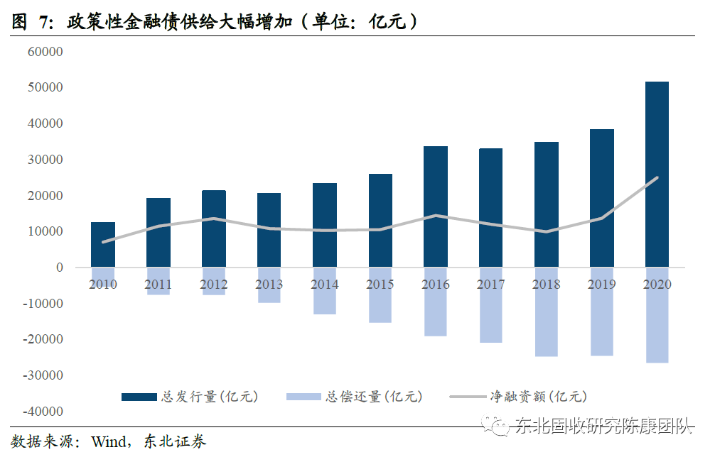01 不太寻常的利率债供给 1.1 利率债供给情况 2020年的新冠疫情冲击百年难遇,为应对疫情影响,财政政策紧急发力,强调积极有为、提质增效。从债券市场一级发行情况来看,2020年的利率债供给无论从规模、结构还是节奏上,均较往年出现较大偏离。 首先,从发行规模来看,2020年利率债的总发行量为187662亿元,较2019年增加64160亿元;总偿还量78124亿元,较2019年增加16304亿元;净融资额109538亿元,较2019年增加47856亿元。 其次,从发行结构来看,2020年利率债发行量占所有债券发行量的比重为32.98%,而2017-2019年该比例分别为28.48%、25.76%、27.33%。由于2020年的抗疫特别国债以及各专项债额度均有特别安排,致使2020全年利率债发行占比出现了显著提升。 分类来看,国债发行规模的增加尤为明显。2020年,国债发行量占利率债总发行量的比例出现边际提升,2020年占比为37.93%,2017-2019年该比例分别为34.38%、32.36%、33.72%。同时,政策性金融债和地方政府债的占比有所下滑,2020年政策性金融债占比为27.74%,2017-2019年该比例分别为28.20%、30.67%、30.96%;2020年地方政府债占比为34.34%,2017-2019年该比例分别为37.42%、36.87%、35.32%。 最后,从供给节奏来看,往年一、二季度利率债发行量逐月上升,三季度是利率债发行的高峰,四季度发行开始减速。2020年受疫情影响,上半年财政政策发力明显,5月份是利率债发行量的首次高峰,下半年逐渐回归常态化,8月份又出现第二轮供给高峰,随后渐进正常轨道。从净融资额来看,5月和8月依然是两轮高峰,主要系年内财政紧急发力和逐步退出的节奏导致。 1.2 国债供给情况 从国债发行规模来看,2020年国债发行量为71173亿元,偿还量为30820亿元,净融资额为40353亿元,较2019年明显增加,增幅分别为70.92%、27.92%、129.97%。2020年国债净融资403531中,剔除特别国债10000亿元,剩余一般国债净融资30353亿元,已经超过年度中央赤字目标规定的27800亿元。这一部分数据异常主要来源于贴现国债,通常用于年内调剂,自2016年起贴现国债发行额一直保持在6000亿元附近,但2020年增至14909亿元。 从发行节奏来看,2020年二季度国债发行出现提速,供给高峰在二三季度,而往年的国债供给通常在年内较为平滑。从净融资额节奏来看,一二季度净融资走势与往年相差较大,三四季度逐渐回归常态,但是净融资额明显高于历史平均。其原因是一二季度偿还较多,同时6、7月额外发行抗疫特别国债10000亿元。 1.3 政金债供给情况 2020年政策性金融债发行量为52051亿元,偿还量为26547亿元,净融资额为25504亿元,较2019年分别增加为36.12%、8.03%、86.66%。 政策性金融债发行和净融资规模的大幅提升主要受到两方面因素影响: (1)政策要求加大对于实体企业的信贷支持力度,因此政策性银行需要发行债券来补充负债; (2)PSL规模持续下降(2020年12月PSL为32350亿元,较年初1月下降3224亿元,2021年PSL继续收缩,2月数据为32104亿元),政策性银行负债缺口增加,因此需要发行债券来补充负债。 从发行节奏来看,政策性金融债发行在全年内较为平均,没有明显的季度特征,2020年基本维持了稳定发行的节奏。从净融资额来看,7月份政金债净融资额出现异常高峰,其余时期均与历史规律一致。 1.4 地方政府债 2020年地方政府债发行量为64438亿元,偿还量为20757亿元,净融资额为43681亿元,较2019年分别增长47.71%、57.83%、43.35%。 从发行量节奏来看,2020年5月和8月是地方债发行的两个高峰,而6-7月的地方债发行量偏低,与往年节奏不太一致。主要原因是2020年地方政府债为特别国债让路的特征尤为明显,因此在6月和7月减少地方债发行,并在之前和之后的两个月中增加发行量。净融资额的节奏也与之类似。 |