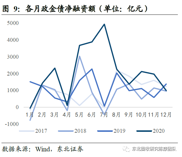 从供给节奏来看,往年一、二季度利率债发行量逐月上升,三季度是利率债发行的高峰,四季度发行开始减速。2020年受疫情影响,上半年财政政策发力明显,5月份是利率债发行量的首次高峰,下半年逐渐回归常态化,8月份又出现第二轮供给高峰,随后渐进正常轨道。从净融资额来看,5月和8月依然是两轮高峰,主要系年内财政紧急发力和逐步退出的节奏导致。
