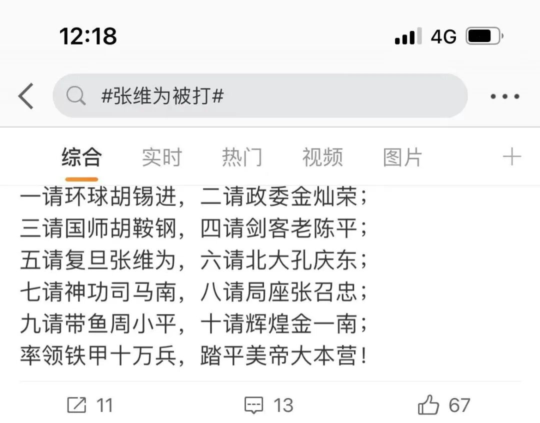 昨天,一则关于“复旦大学张维为教授被打”的话题,被顶上了微博的热搜榜。