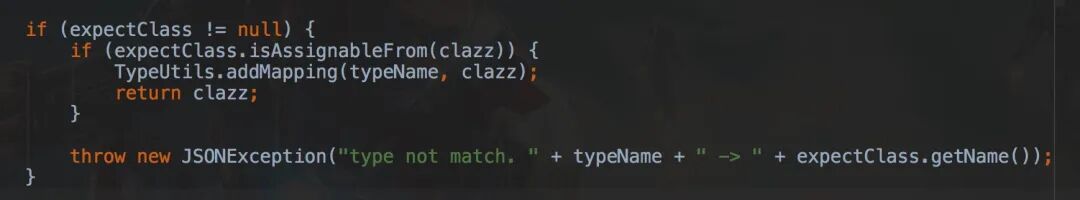 于是在 v1.2.48中,fastjson修复了这个bug,在MiscCodec中,处理Class类的地方,设置了fastjson cache为false,这样攻击类就不会被缓存了,也就不会被获取到了。 在之后的多个版本中,黑客与fastjson又继续一直都在绕过黑名单、添加黑名单中进行周旋。 直到后来,黑客在 v1.2.68之前的版本中又发现了一个新的漏洞利用方式。 利用异常进行攻击 在fastjson中, 如果,@type 指定的类为 Throwable 的子类,那对应的反序列化处理类就会使用到 ThrowableDeserializer 而在ThrowableDeserializer#deserialze的方法中,当有一个字段的key也是 @type时,就会把这个 value 当做类名,然后进行一次 checkAutoType 检测。 并且指定了expectClass为Throwable.class,但是在checkAutoType中,有这样一约定,那就是如果指定了expectClass ,那么也会通过校验。  因为fastjson在反序列化的时候会尝试执行里面的getter方法,而Exception类中都有一个getMessage方法。 黑客只需要自定义一个异常,并且重写其getMessage就达到了攻击的目的。 这个漏洞就是6月份全网疯传的那个"严重漏洞",使得很多开发者不得不升级到新版本。 这个漏洞在 v1.2.69中被修复,主要修复方式是对于需要过滤掉的expectClass进行了修改,新增了4个新的类,并且将原来的Class类型的判断修改为hash的判断。 其实,根据fastjson的官方文档介绍,即使不升级到新版,在v1.2.68中也可以规避掉这个问题,那就是使用safeMode 可以看到,这些漏洞的利用几乎都是围绕AutoType来的,于是,在 v1.2.68版本中,引入了safeMode,配置safeMode后,无论白名单和黑名单,都不支持autoType,可一定程度上缓解反序列化Gadgets类变种攻击。 设置了safeMode后,@type 字段不再生效,即当解析形如{"@type": "com.java.class"}的JSON串时,将不再反序列化出对应的类。 ParserConfig .getGlobalInstance ().setSafeMode (true );