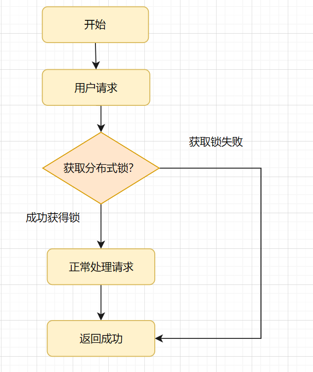 分布式锁实现幂等性的逻辑就是,请求过来时,先去尝试获得分布式锁,如果获得成功,就执行业务逻辑,反之获取失败的话,就舍弃请求直接返回成功。执行流程如下图所示:
