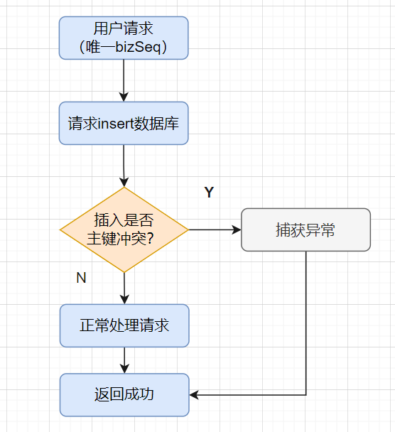 insert插入,如果insert成功,则直接返回成功,如果insert产生主键冲突异常,则捕获异常,接着直接返回成功。流程图如下