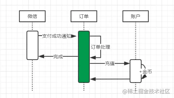 考虑支付重构的时候,自然想到原本属于一个本地事务中的处理,现在要跨应用了要怎么处理。拿充值订单举个栗子吧,假设:原本订单模块和账户模块是放在一起的,现在需要做服务拆分,拆分成订单服务,账户服务。原本收到充值回调后,可以将修改订单状态和增加金币放在一个mysql事务中完成的,但是呢,因为服务拆分了,就面临着需要协调2个服务才能完成这个事务
