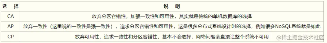需要明确的一点是,对于一个分布式系统而言,分区容错性是一个最基本的要求。因为 既然是一个分布式系统,那么分布式系统中的组件必然需要被部署到不同的节点,否则也就无所谓分布式系统了,因此必然出现子网络。而对于分布式系统而言,网 络问题又是一个必定会出现的异常情况,因此分区容错性也就成为了一个分布式系统必然需要面对和解决的问题。因此系统架构师往往需要把精力花在如何根据业务 特点在C(一致性)和A(可用性)之间寻求平衡。