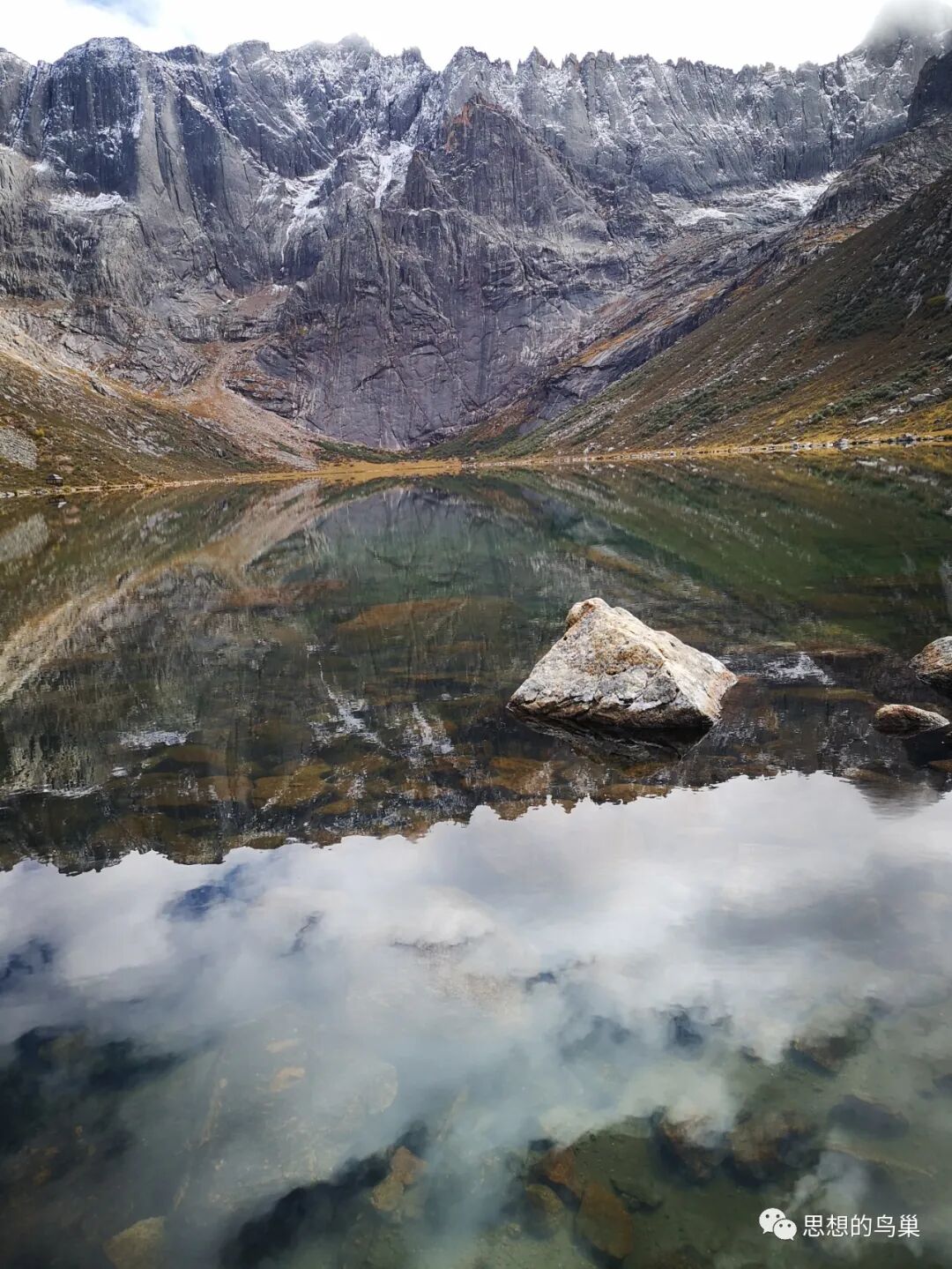 莲宝叶则的美需要身临其境的感受,有三条线,我们去了扎尕尔措,这是景区最主要线路。山水倒映蓝天白云群山,图片难以体会。数了一下,湖水中有六、七种颜色,四周峭壁,对面一片城墙似的石峰高耸,山顶有雪。庄严肃穆形容群山的无言最贴切。任何自然之美都需要你靠近它。