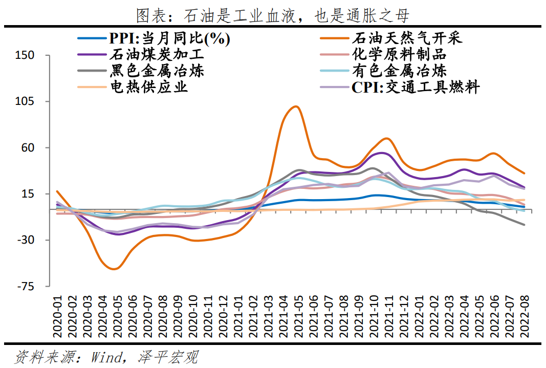 原油是工业的血液、也是通胀之母,原油上涨导致油价及工业原材料价格走高,从而引发通胀。但因国内政策执行到位,PPI处于回落趋势。自3月俄乌冲突以来,国内PPI同比录得8.3%,环比录得1.1%;回落至8月同比2.3%水平。