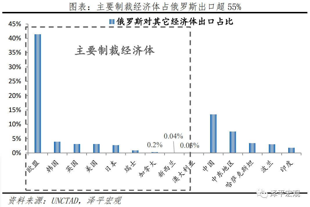 2020年俄罗斯贸易总量5726亿美元,占全球贸易总量的1.6%;乌克兰贸易总量1031亿美元,占全球贸易总量0.3%;对结构的影响大于总量。