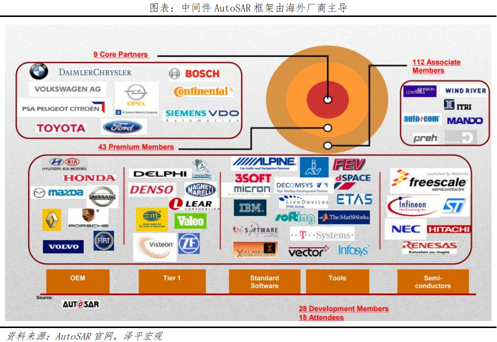 中层是中间件,是解决不同供应商软硬件兼容性问题的核心,也是域控制器产品中技术壁垒最高的环节。通过集成的AutoSAR汽车开发系统架构,连接上层应用软件和底层操作系统,实现交互。中间件的开发需要投入极高的时间、人力和财务成本,此外,还需要与多家供应商长时间合作来进行产品兼容性调试与匹配。中间件准入门槛高,AutoSAR框架从2003年建立至今,联盟包含近200家企业,只有9家核心企业和63家一级会员能实际参与到开发模式的筹划、管理和调控。我国有百度、华为、经纬恒润、国汽智控等8家是一级会员,完成中间件的自主替代是长期较为艰巨的任务。