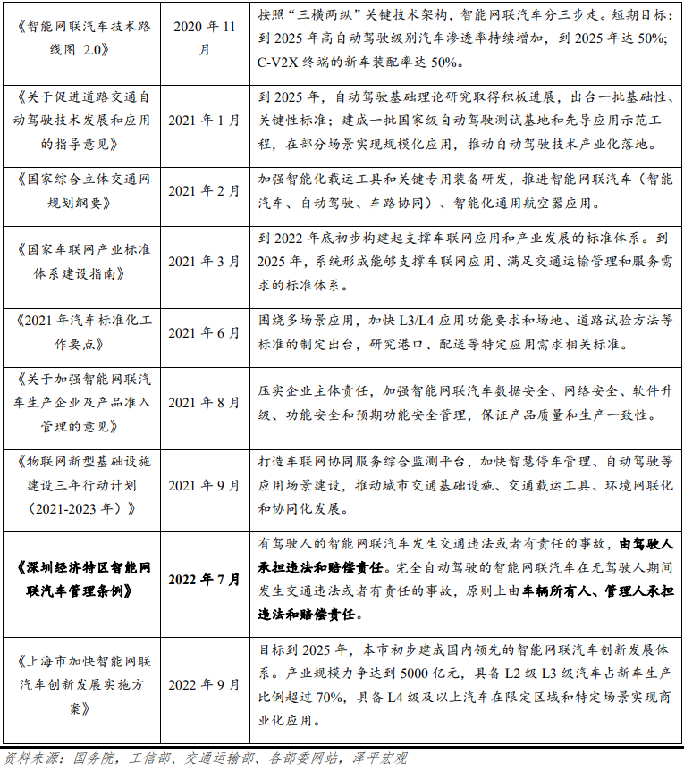 2020年,作为第一个重要节点,我国总结过去自动驾驶发展取得的进展,并展望了5年,重新制定自动化分级标准。2020-2022年推出一系列政策,针对性地对产业链完善、场景化应用、具体技术创新做出发展指引。2022年7月,深圳迎来了划时代的“我国首部L3级自动驾驶法规”,9月,上海出台政策对L3级实际落地和L4级商业化应用提供了支持。