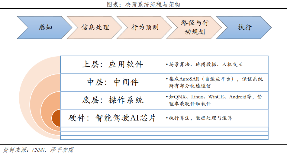 决策系统的任务是将感知的结果进行信息处理、行为预测、规划路径,最后传输给执行系统去执行,决策系统分为三大软件层和芯片硬件层。上层的软件,负责最表层的信息和数据处理,人机交互,由底层的操作系统管理提供支持。中间层的中间件连接上下层,直接与操作系统交互,保障所有部分的快速通讯和运行。最终由硬件层的智能驾驶AI芯片执行算法和数据处理运算。从产业链发展来看,上层应用软件算法、中层中间件、和AI芯片是技术挑战最多的环节。