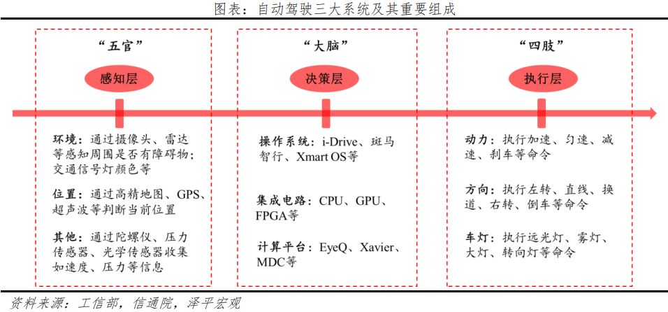 智能驾驶的实现,本质上是感知、决策、执行三大核心系统的协同,分别负责环境感知与定位、智能规划与决策、控制执行。如果将其类比:感知层相当于人的五官,感知周围的环境,搜集数据传输到决策层;决策层相当于人的大脑,处理数据,输出相应的操作指令给执行层;执行层相当于人的四肢,执行大脑给出的指令。感知层主要是环境感知、位置感知、速度、压力感知,关键软硬件设备包括车载摄像头、超声波雷达、毫米波雷达、激光雷达、高精度地图等。决策层主要是包括算法操作系统、AI芯片、计算平台;执行层主要包括动力供给、方向控制、车灯控制。