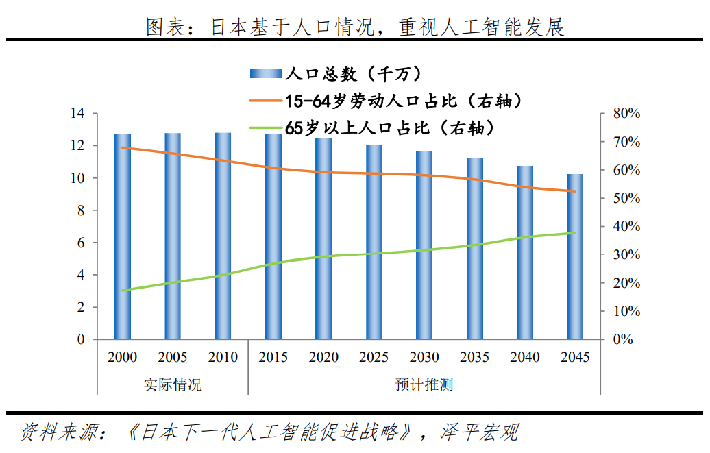 日本出于应对老龄化社会所带来的人口减少、劳动力下滑等挑战,着重研究人工智能在机器人、医疗、汽车交通等领域的应用。日本老龄化、少子化等问题造成了生产力短缺,对日本经济、社会产生负面影响。在该背景下,人工智能被认为是经济增长的“第四次产业革命”,以2016年发布的《日本下一代人工智能促进战略》为启始,不断推出相关政策规划,围绕“基础研究-应用研究-产业化”三个方面,其中日本总务省下设的信息通信技术研究所和文部科学省进行人工智能理论和技术研发,经产省解决应用场景问题。经产省建立的人工智能研究中心(AIRC)促进产学研合作,主要承担成果转化和推广。2020年7月,日本政府发布《统合创新战略2020》,战略提出在控制风险的同时提高生产效率、丰富民众生活,必须运用人工智能、超算等新技术,加快推进数字化转型。