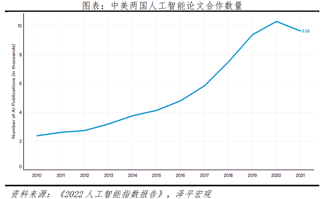 其中,中国、美国是论文发表大国,中美两国发布论文合计占全球44.7%。从2010年到2021年,美国和中国在人工智能出版物方面的跨国合作数量最多,增长了5倍。