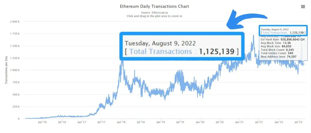 据数字经济学家估计,目前以太坊挖矿每年将消耗44.5太瓦时,约等于荷兰国家一整年的电量消耗。以太坊一笔交易的耗电量就超过了一个美国家庭平均一天的用电量。据以太坊官网显示,以太坊全球正在运行的节点有9728个,仅2022年8月9号一天,以太坊就有112万笔交易被写进区块链。