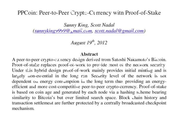 终于在2012年8月,Sunny King与学者Scott Nadal联名发表了白皮书——《PPCoin: 基于权益证明的点对点的加密货币》,首度提出了权益证明的共识机制,与比特币的能耗问题针锋相对。同时,Sunny King正式推出点点币,创造了全球第一个把权益证明落地的区块链项目。