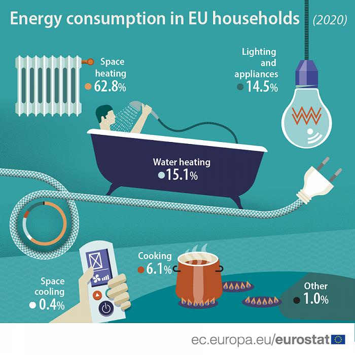 由于地处高纬度地区,欧洲的冬季总是无比漫长,取暖在居民日常生活中自然变得非常重要。根据欧盟统计局的数据,在2020年里,欧洲的各项家庭能源消耗项目中,取暖的占比最大,高达62.8%;其次为加热生活用水,占15.1%;照明和电器仅占14.5%。