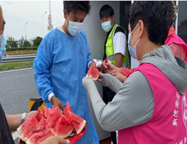 15日下午,建华村妇联主席组织湾嫂与党员志愿者集结完毕,购买了200多支棒棒、4箱棒冰、几个大西瓜以及各种防暑药物,前来高速卡口送清凉。